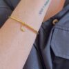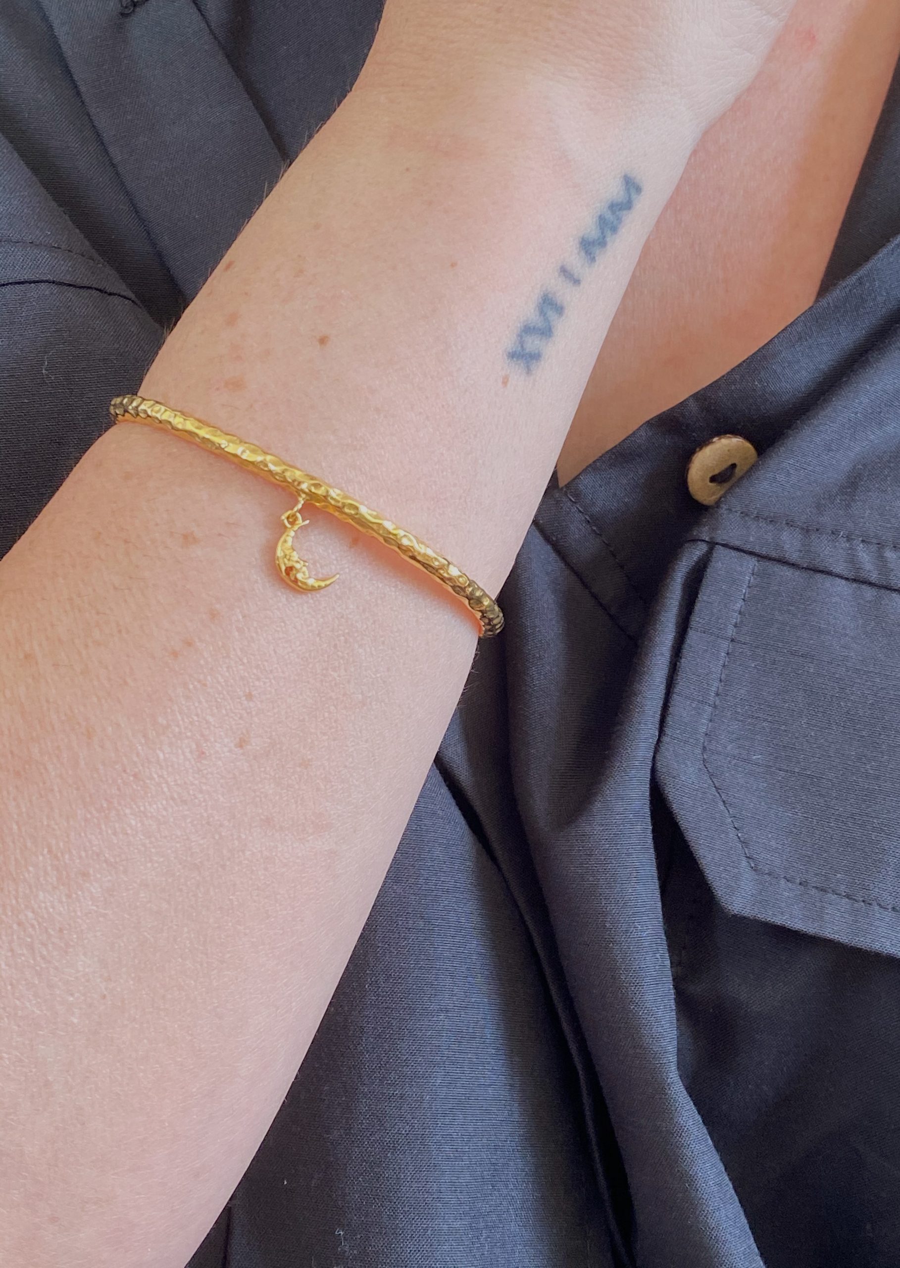 The moon in the form of a tiny charm hanging in the center of this dreamy cuff.