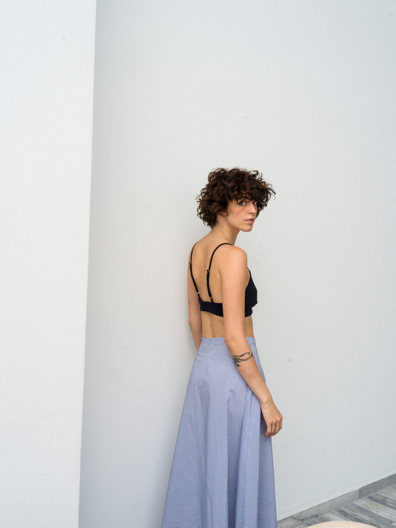The A line, midi length & high-waisted skirt features front button fastening and pockets from the same fabric. The Buttons Skirt is one of the most comfortable choices for all Spring & Summer days as you can even wear it with your swimsuit.