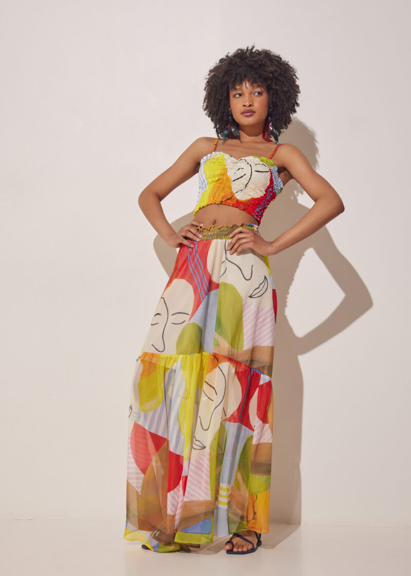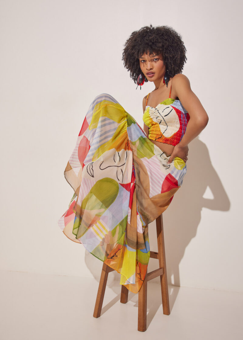 This airy exquisite one-size boho maxi skirt printed in hug line painting on fabric art is made of luxurious silk layers, with a short inner skirt, making our way lighter into the summer season. The SELF-LOVE handmade print is gathered in two tiers, creating breezy movement as you walk. The waist is made from a soft gathered elastic band and the inner lightweight silky skirt is short length. Loose silk fabric elevates summer looks. Create amazing outfits with matching Joy top made of natural fabrics tailored 100% in Greece.