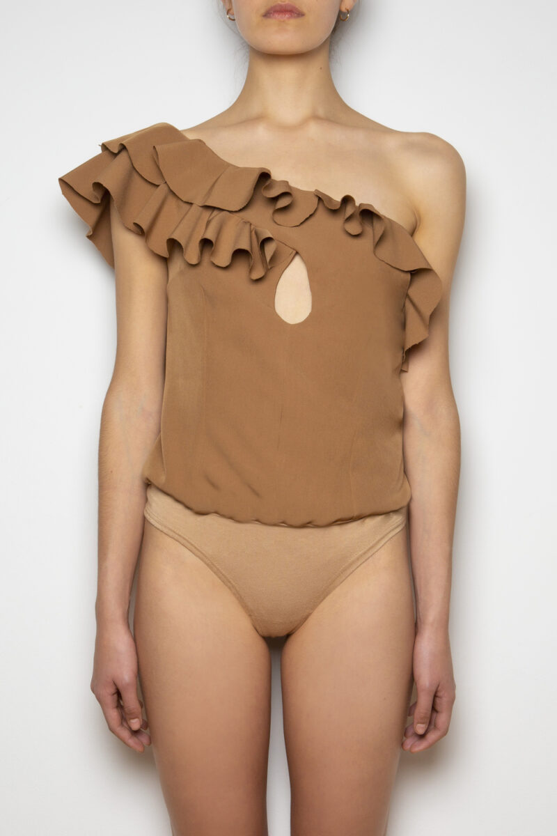 Statement bodysuit that can be easily worn from early afternoon until late night. Combine it with denim pants, nude mules and gold jewelry, revealing the Spaniard that you hide inside. We would suggest that you tie your hair up, to let the ruffle move freely.