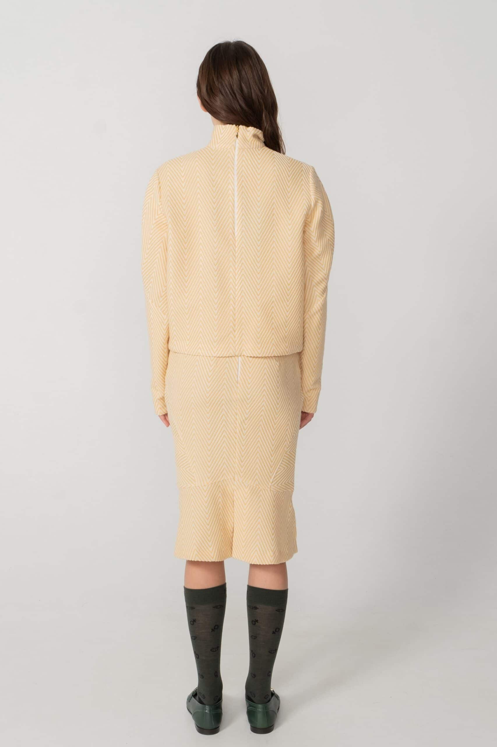 It has a close fit through the body before falling to a flouncy ruffled hem. Style yours with the matching blouse.