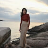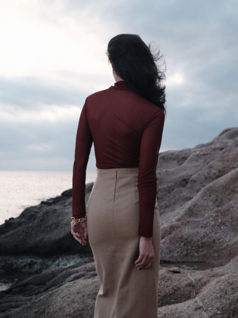 High-waisted tailored fit with a customizable zipper slit for adjustable styling