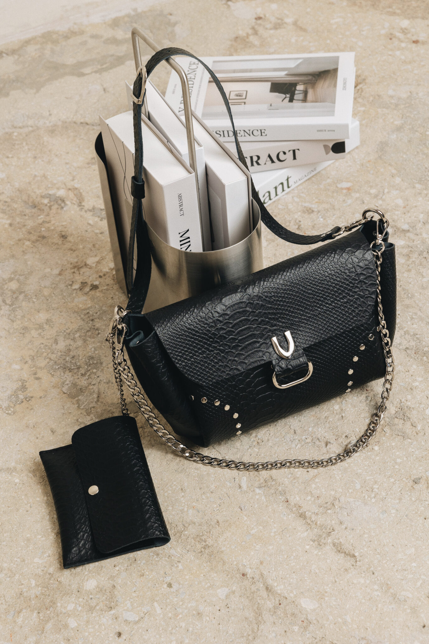 Χειροποίητη δερμάτινη τσάντα ώμου με μεταλλικές λεπτομέρειες, μαγνητικό κούμπωμα και τρία, μία αλυσίδα, ένα δερμάτινο με μεταλλικές λεπτομέριες κ ένα δερμάτινο με δυνατότητα αυξομείωσης. Tα λουριά αφαιρούνται και φοριέται και ως φάκελος. Περιλαμβάνει αποσπώμενο δερμάτινο πορτοφολάκι.