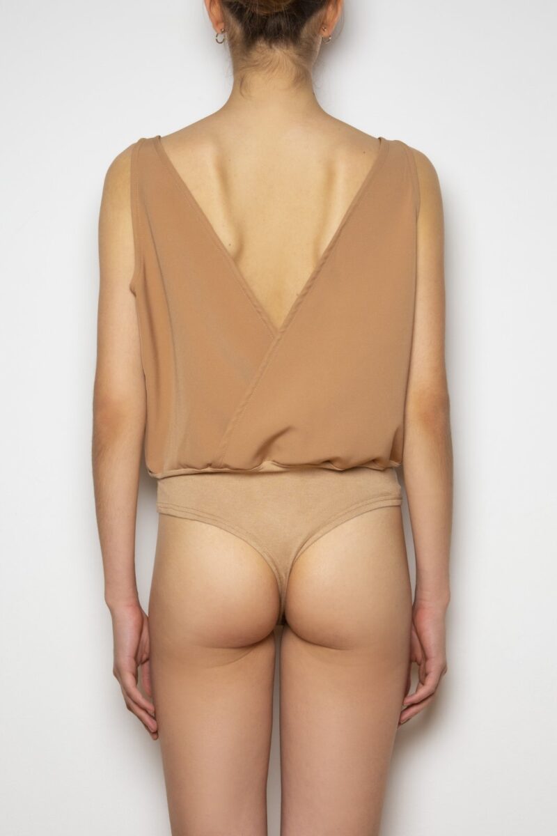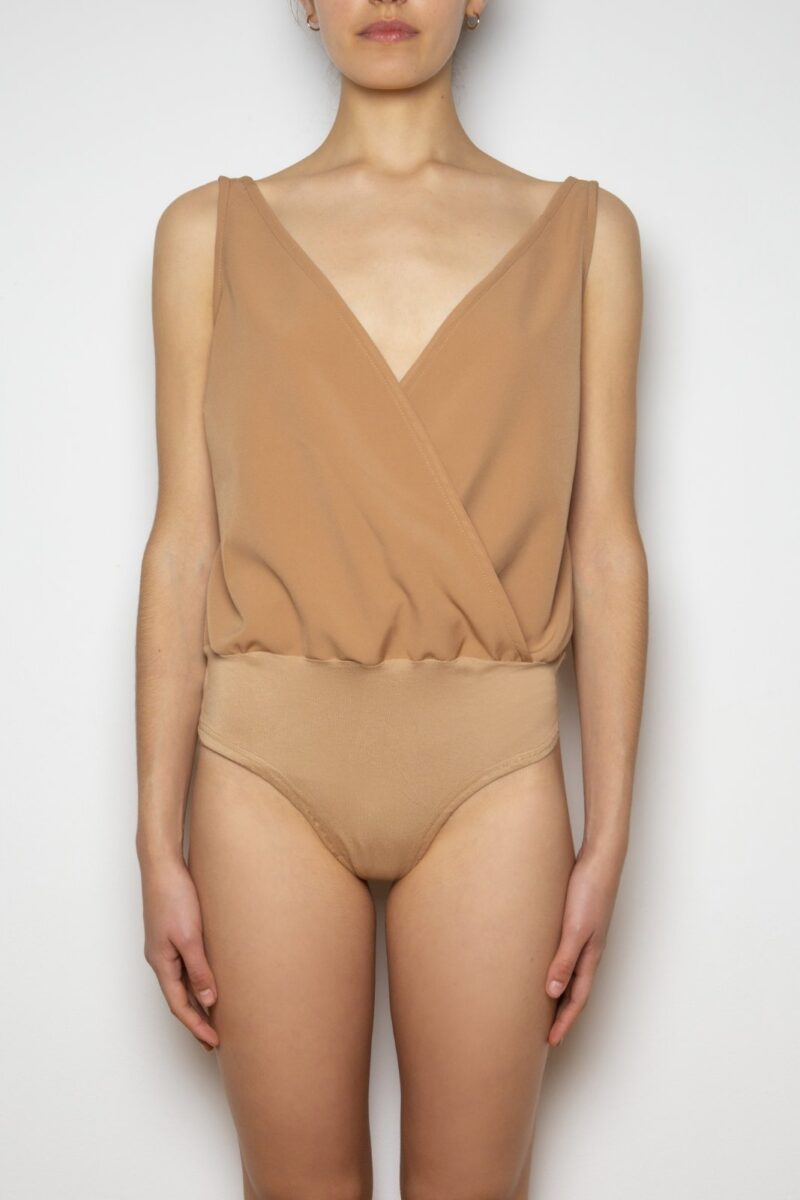 Wrap body in an earthy shade that can be worn all throughout the day and in many ways. We suggest you combine it with a brown wrap skirt and mules, while it is worth knowing that the clip on the chest will not let you be exposed.