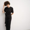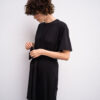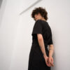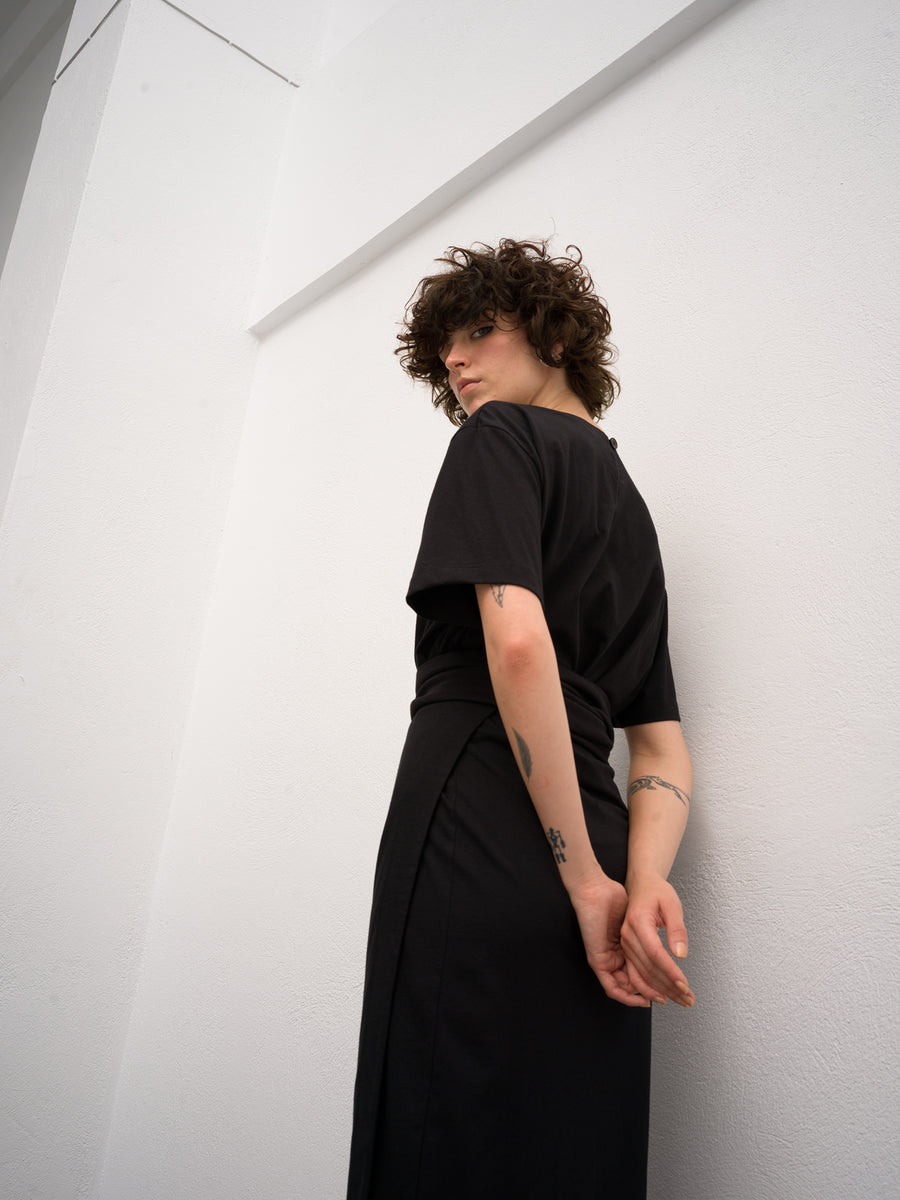 This loose t-shirt has an elastic band at the bottom so you can adjust it or even roll it around your waist and features back button fastening on the neck.