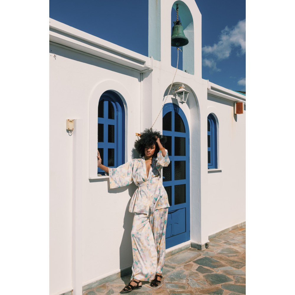 Ψηλόμεση παντελόνα σε φαρδιά γραμμή με πιέτες.