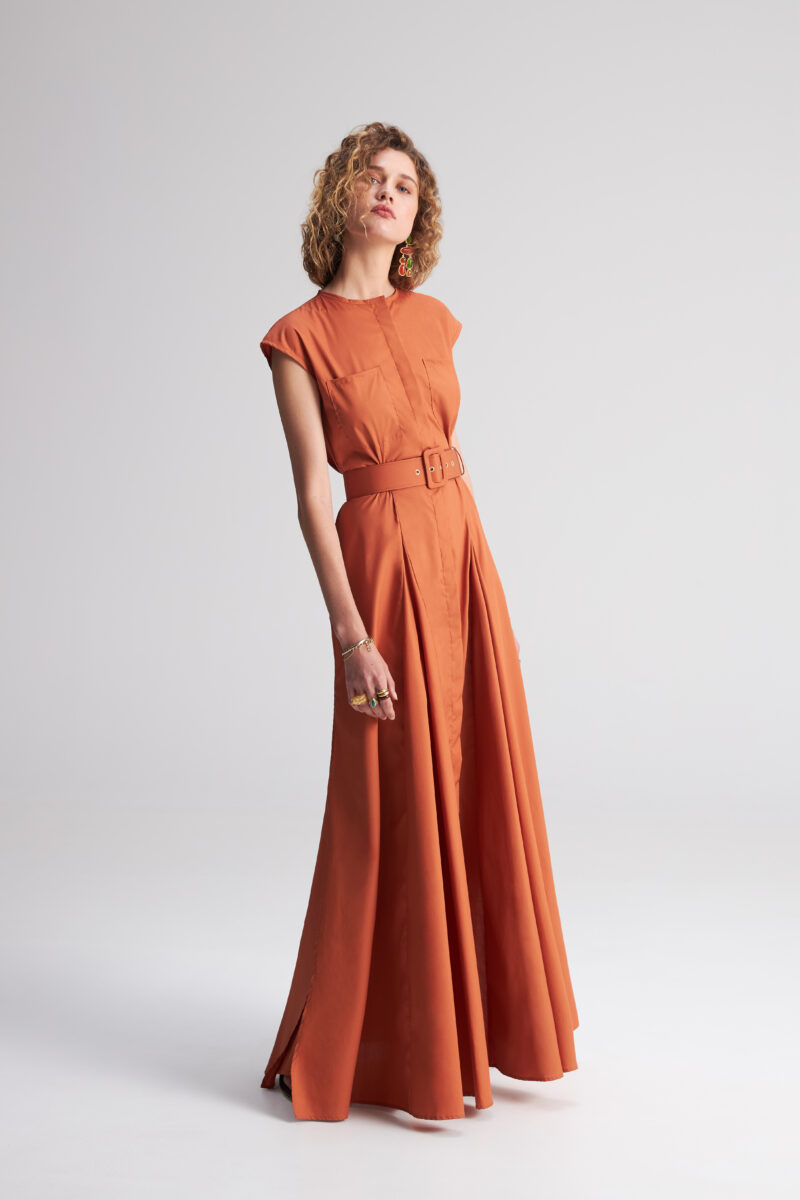 Button-front closure, maxi dress crafted in 100% organic cotton. Comes with a matching belt for added versatility. Whether for a soirée under the stars or an intimate gathering, this maxi dress is a timeless statement piece that radiates charm and allure.