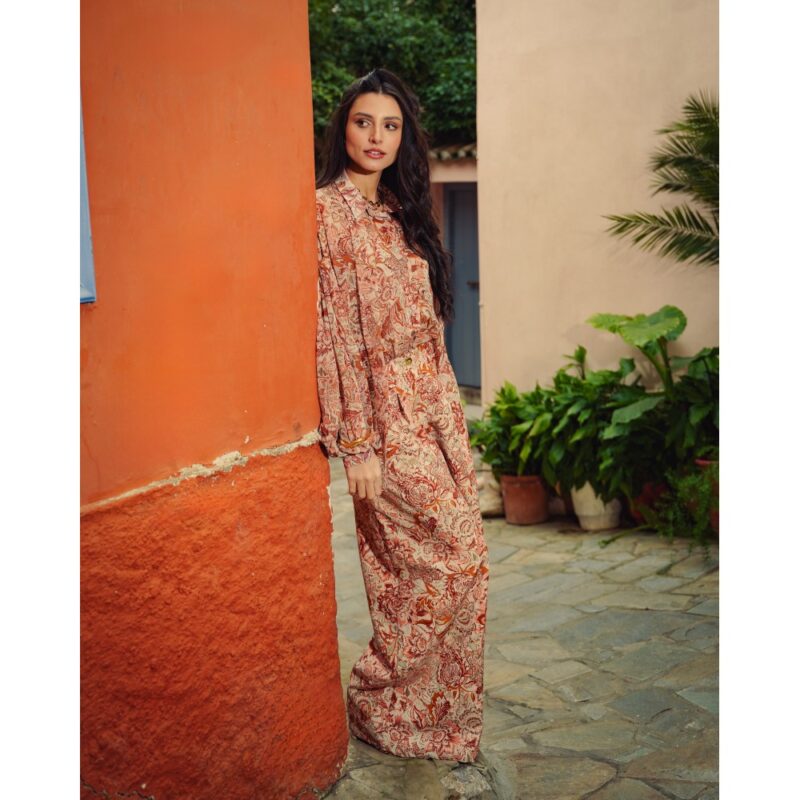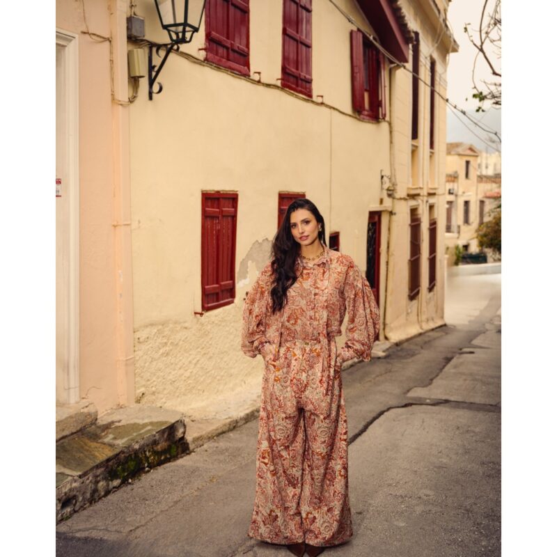 - Ψηλόμεση παντελόνα σε φαρδιά γραμμή με πιέτες.